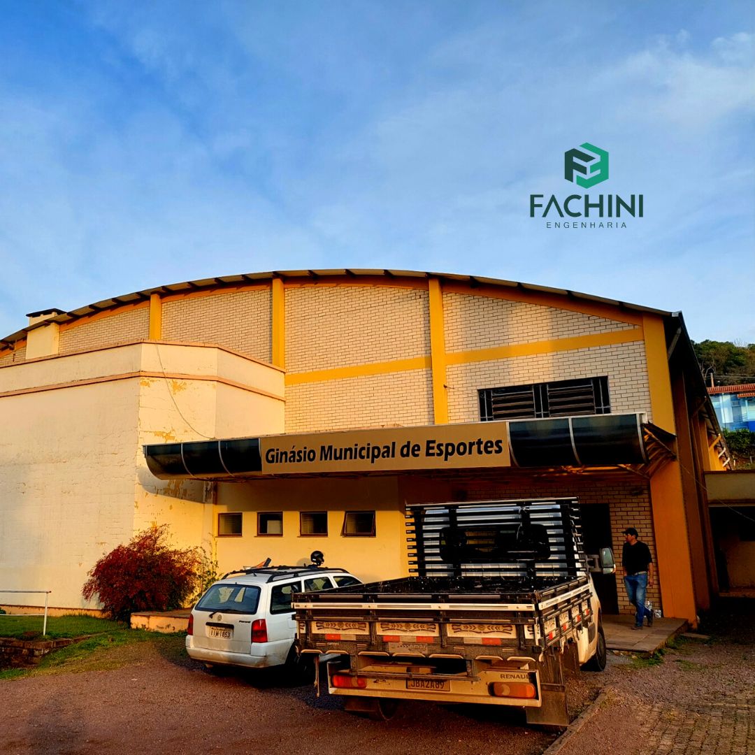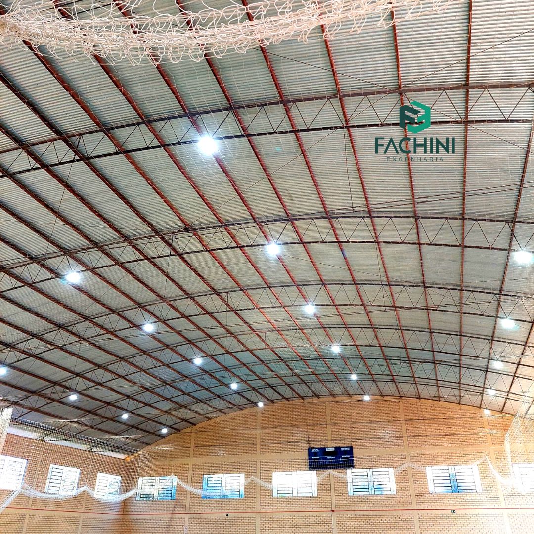 A Fachini Engenharia executou projeto de iluminação de quadra esportiva do Ginásio Municipal de Esportes em Relvado/RS, substituindo as luminárias antigas por refletores LED de alto desempenho.