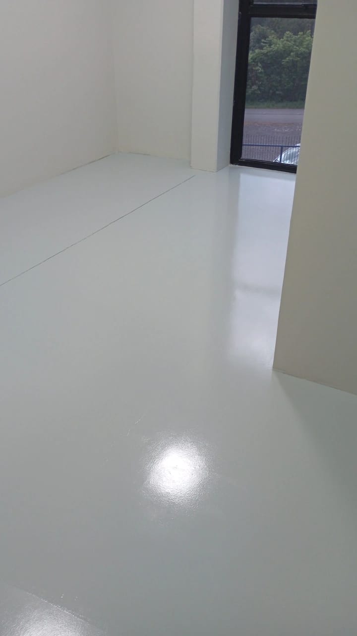Finalizamos recentemente a pintura de piso em tinta epóxi de alto brilho e alta resistência em um escritório corporativo, aplicado sobre piso de concreto polido.