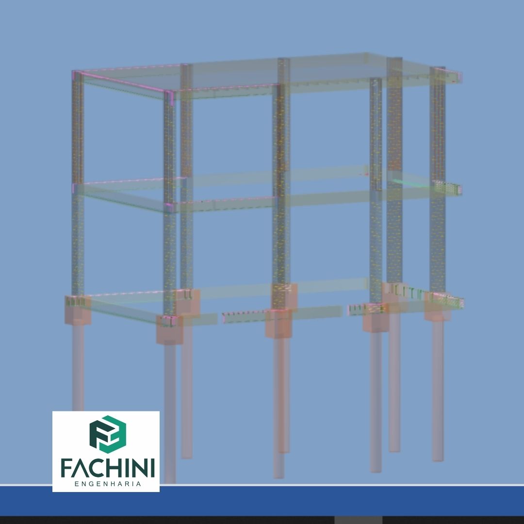Projeto de fundações, pilares, vigas, lajes e cobertura em concreto armado.
